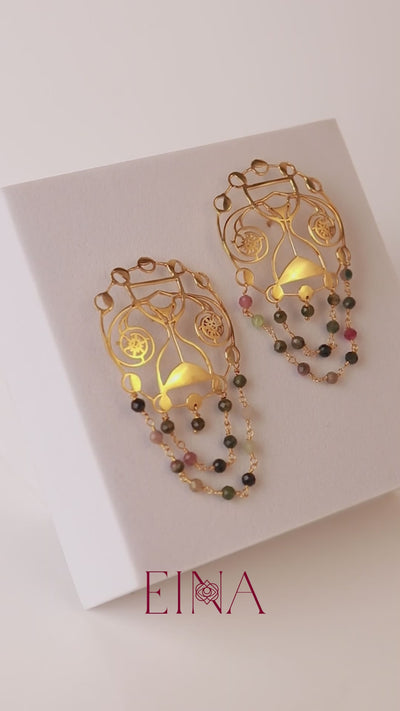 Lightweight statement, chandelier or cocktail earrings with a sand clock and uterus motif with faceted, multi-coloured tourmalines.