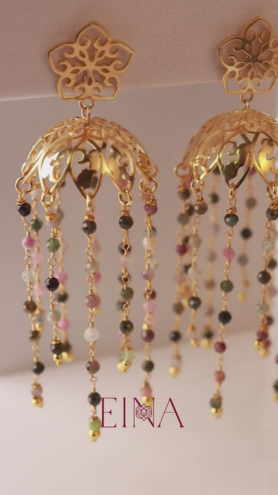 A pair of lightweight jhumka earrings with 60 faceted Multi Tourmalines in each earring.