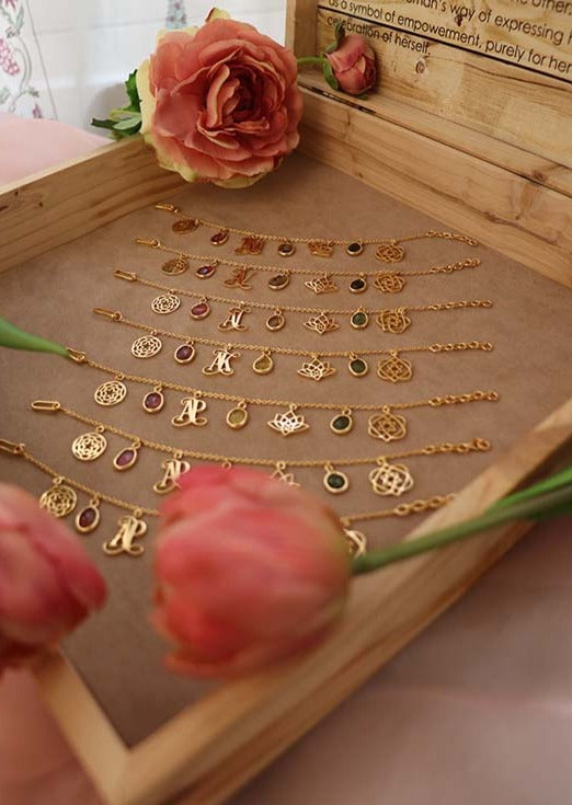 One alphabet is customizable to your request, and rose-cut tourmalines bring inspiration, abundance, peace, love and understanding.