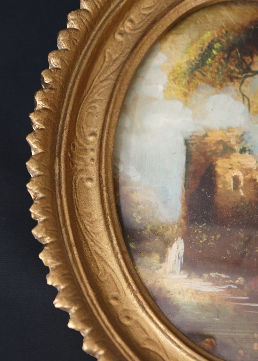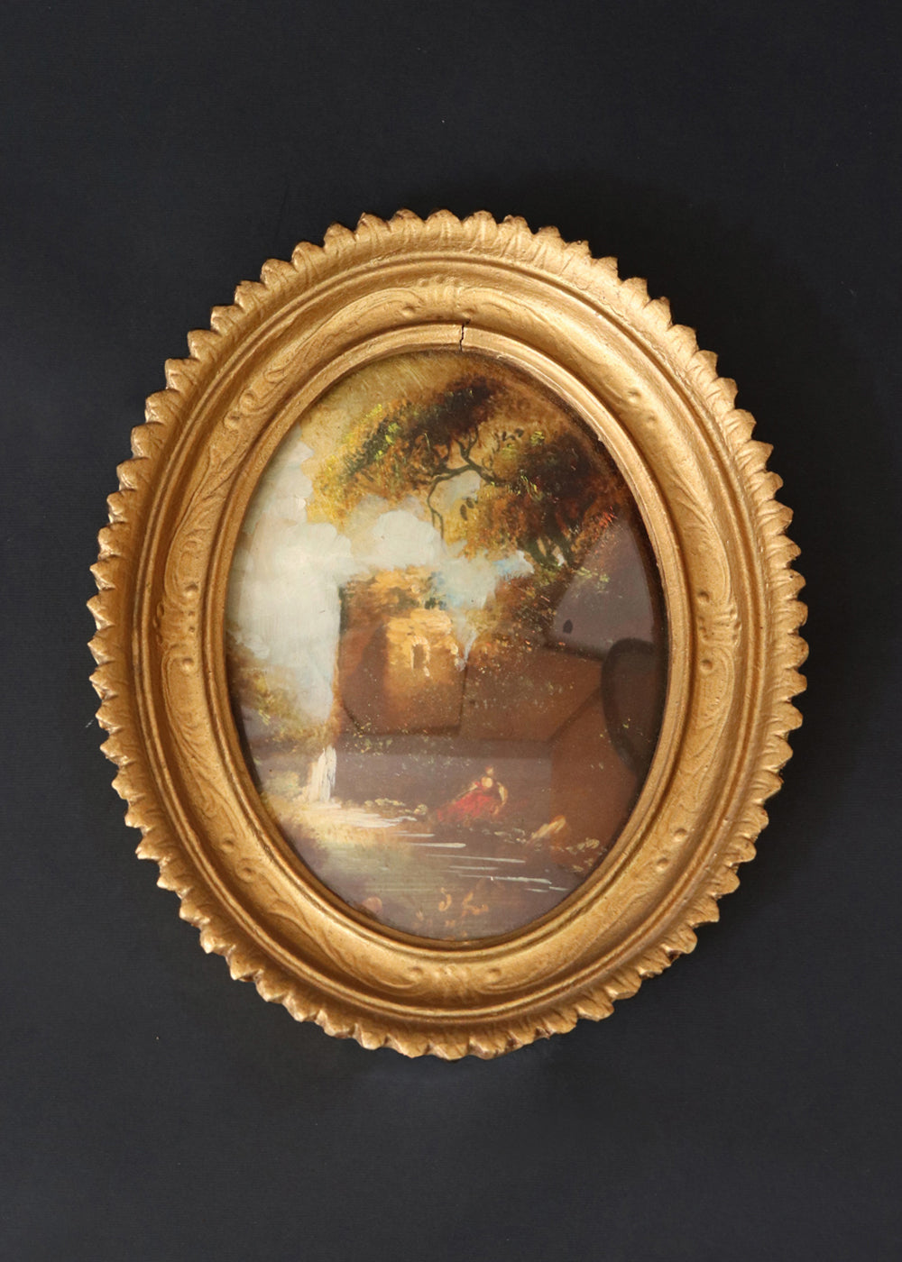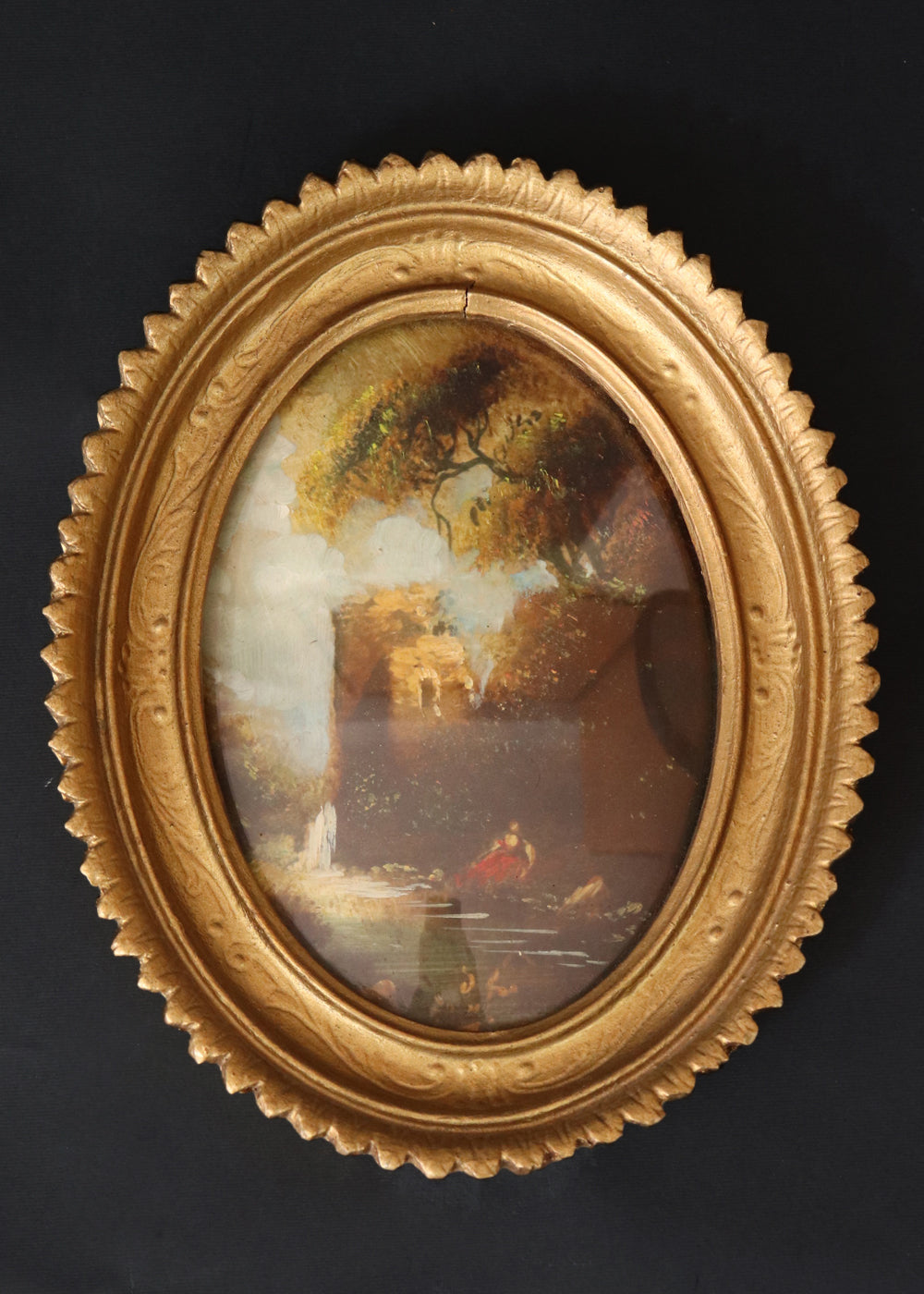 A Victorian period miniature oil painting in impressionist style featuring a woman in a landscape. The painting is in its original oval gold wood frame with a domed glass covering it. She is sitting by a river with some ruins behind her. Most likely from Italy.