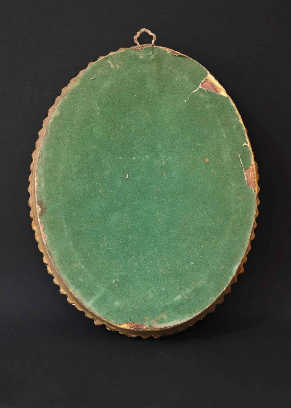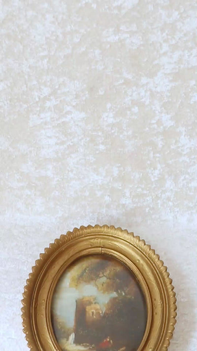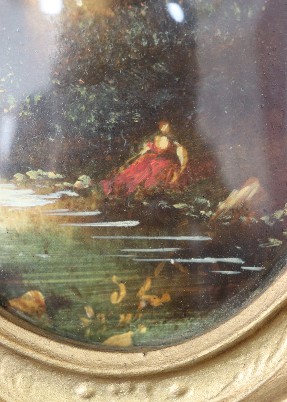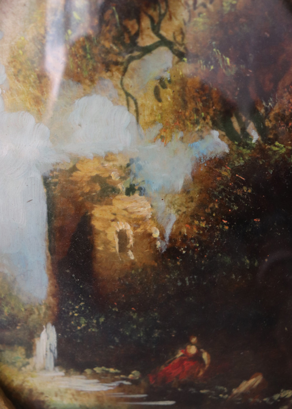 A Victorian period miniature oil painting in impressionist style featuring a woman in a landscape. The painting is in its original oval gold wood frame with a domed glass covering it. She is sitting by a river with some ruins behind her. Most likely from Italy.
