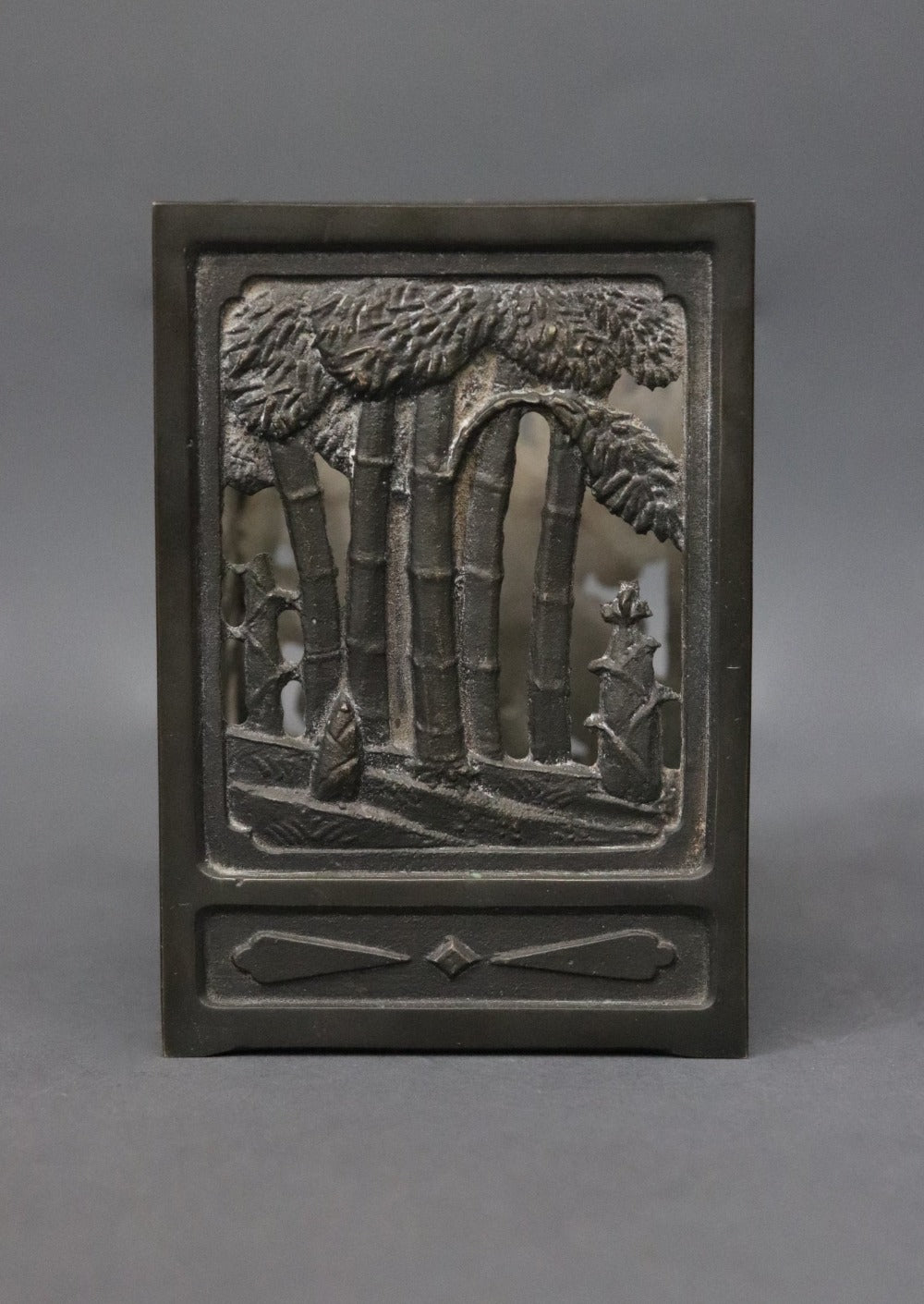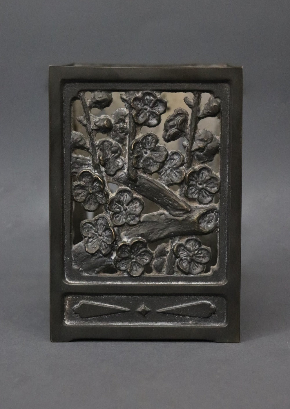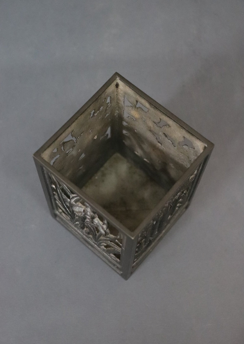 An oriental bitong or bamboo calligraphy brush holder, one of the four treasures found on a scholar’s desk. It has four different patterns on each side- bamboos forest, irises, chrysanthemums and cherry blossoms, all in low relief. Chrysanthemums symbolise happiness and vitality; cherry blossoms represent renewal- life, death and beauty; bamboos stand for virtue, moral integrity, humility, and loyalty; and Irises hope, wisdom, trust and valour. Bitongs were appreciated not only for their functionality but for their aesthetic qualities and values. Can be used as a pen stand or a tea light holder. Most likely made in Japan, early 1900s.