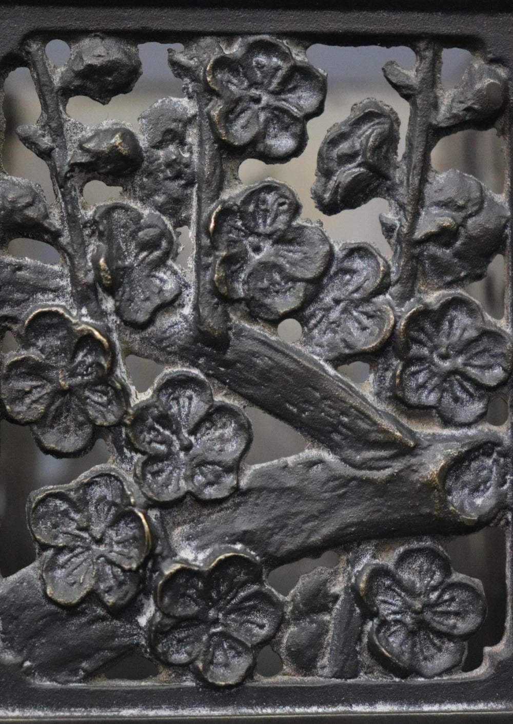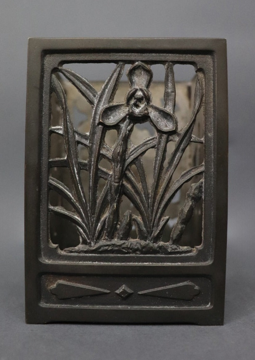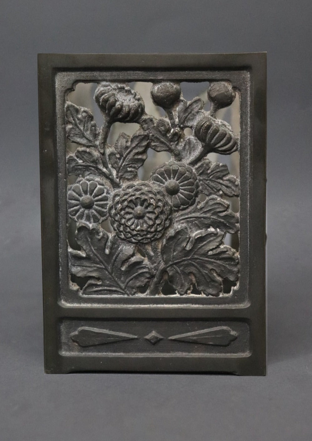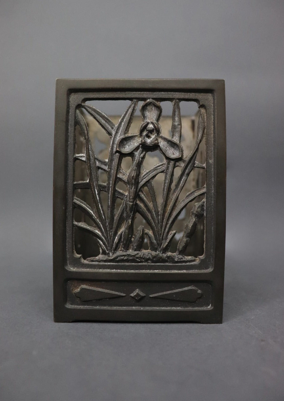 An oriental bitong or bamboo calligraphy brush holder, one of the four treasures found on a scholar’s desk. It has four different patterns on each side- bamboos forest, irises, chrysanthemums and cherry blossoms, all in low relief. Chrysanthemums symbolise happiness and vitality; cherry blossoms represent renewal- life, death and beauty; bamboos stand for virtue, moral integrity, humility, and loyalty; and Irises hope, wisdom, trust and valour. Bitongs were appreciated not only for their functionality but for their aesthetic qualities and values. Can be used as a pen stand or a tea light holder. Most likely made in Japan, early 1900s.