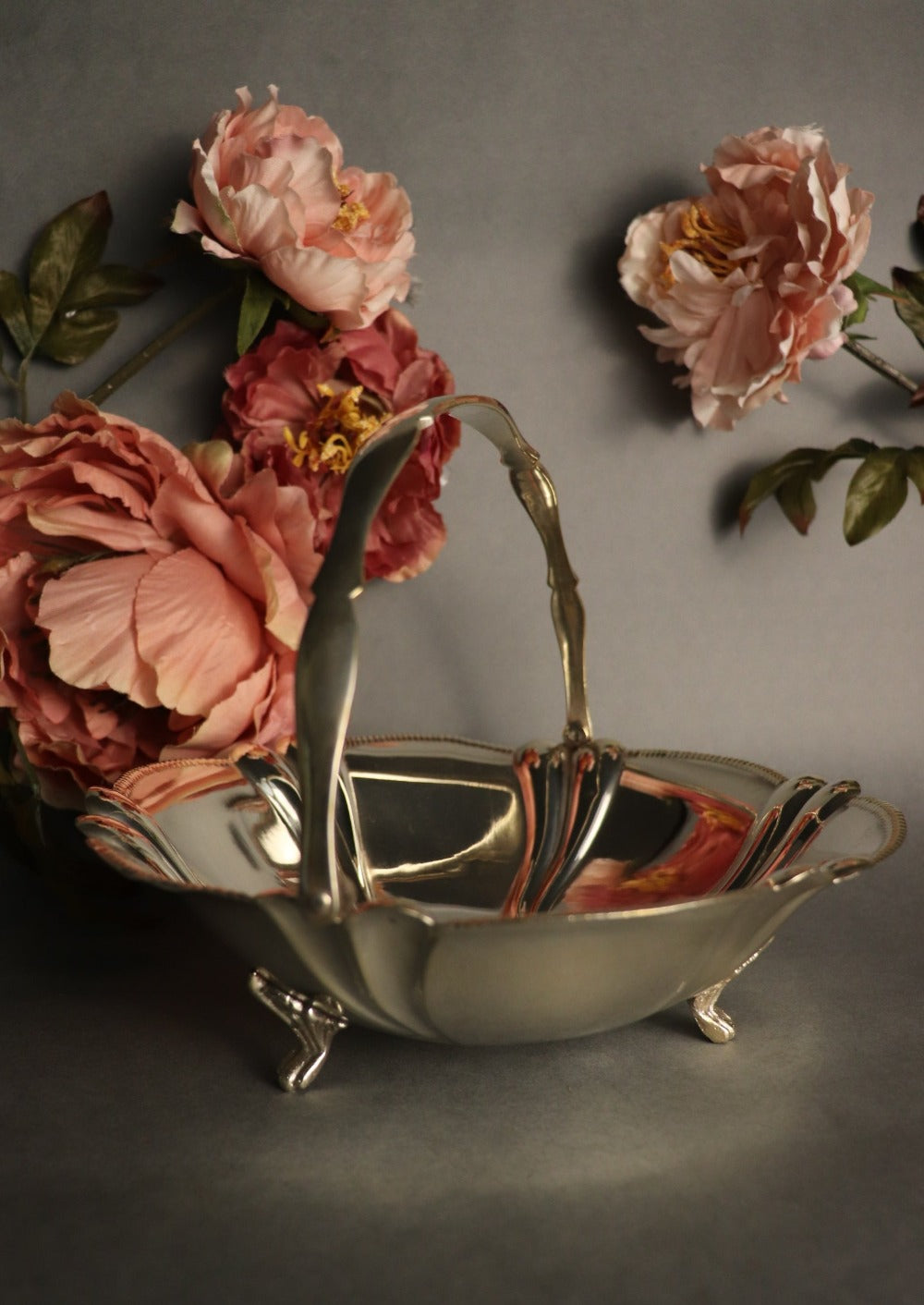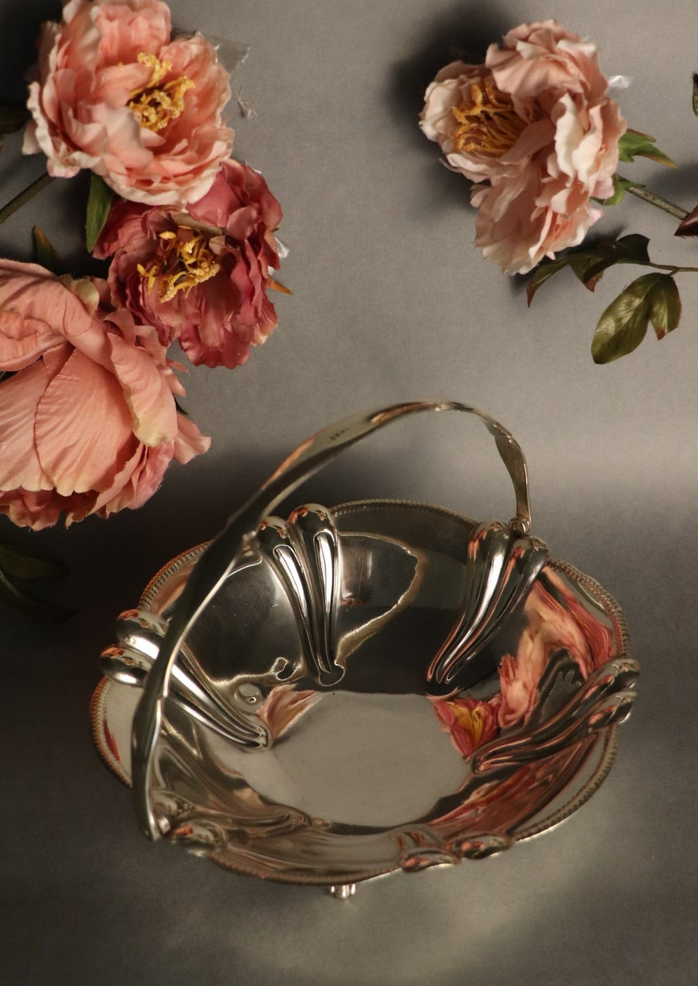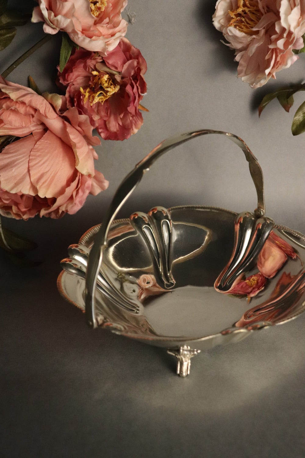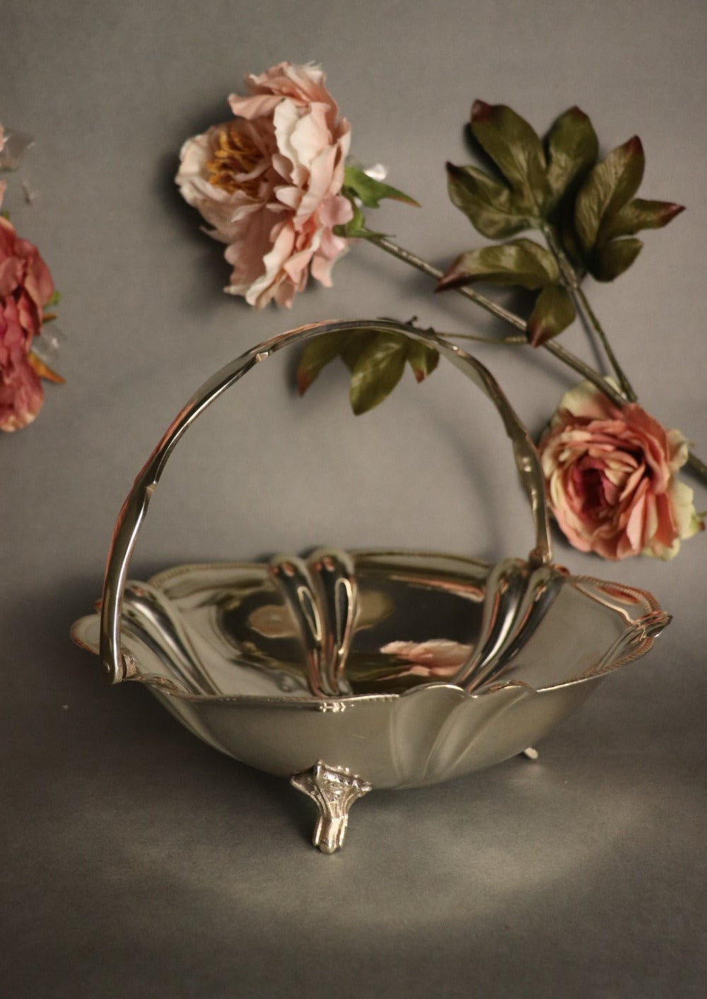 Vintage Art Nouveau silver plated bowl, perfect for flowers or fruits. It stands on 3 feet and has a handle to carry it. Has a stamp that says EPNS, and most likely made in the UK.
