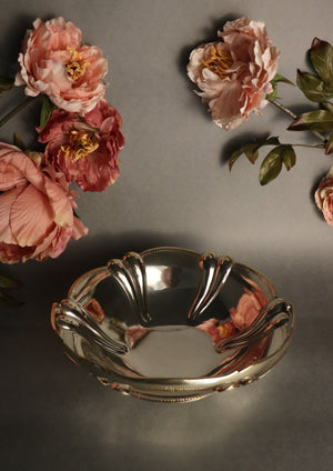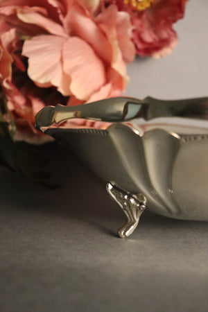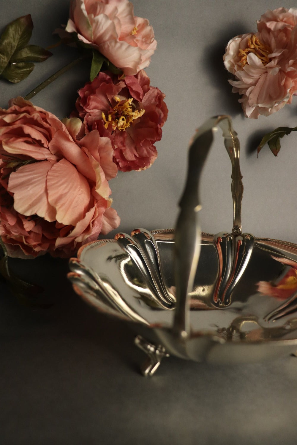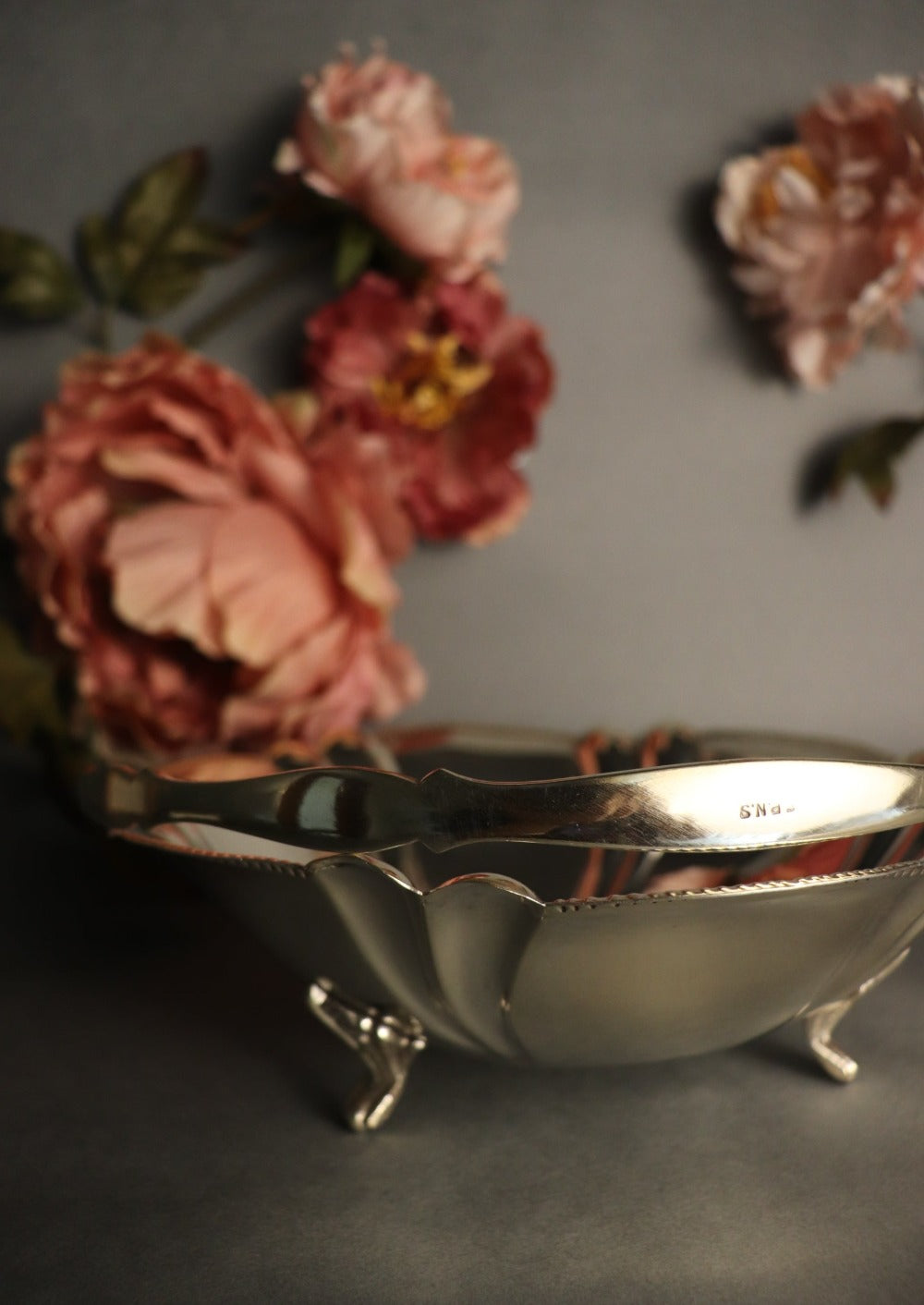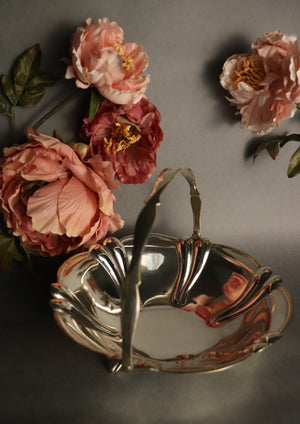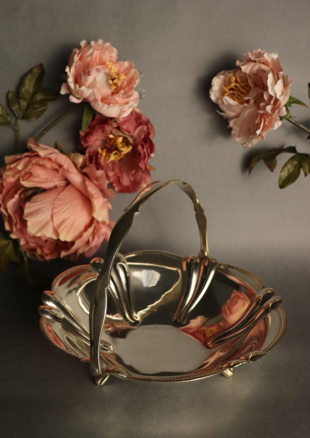 Vintage Art Nouveau silver plated bowl, perfect for flowers or fruits. It stands on 3 feet and has a handle to carry it. Has a stamp that says EPNS, and most likely made in the UK.