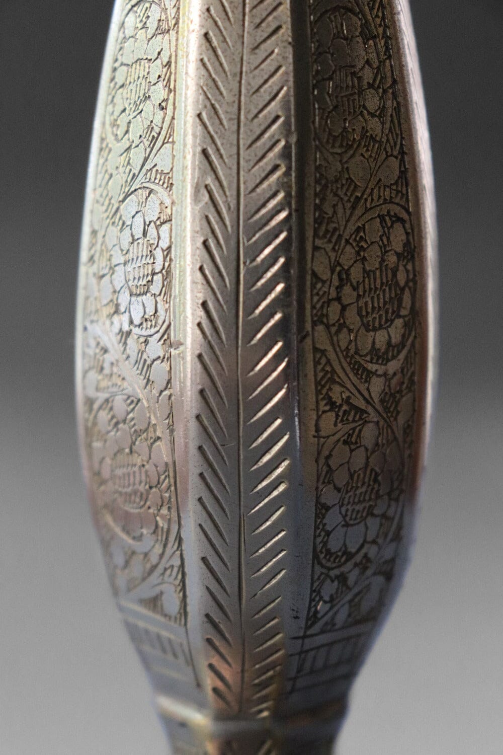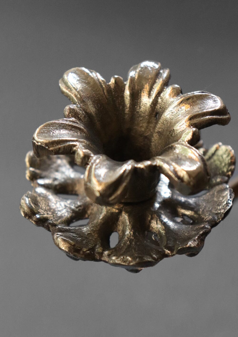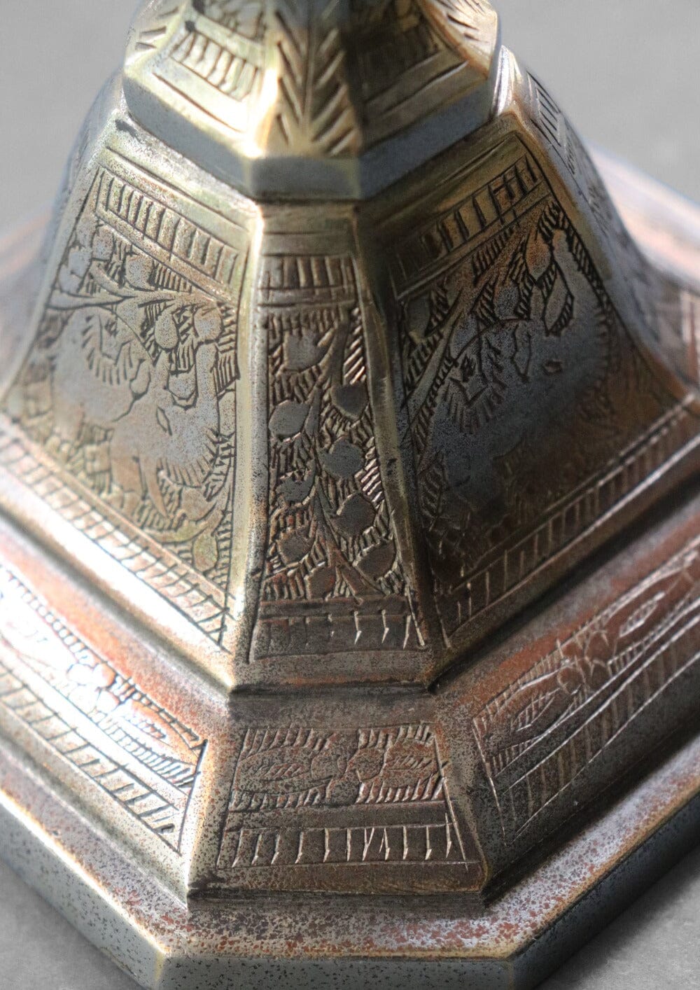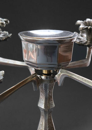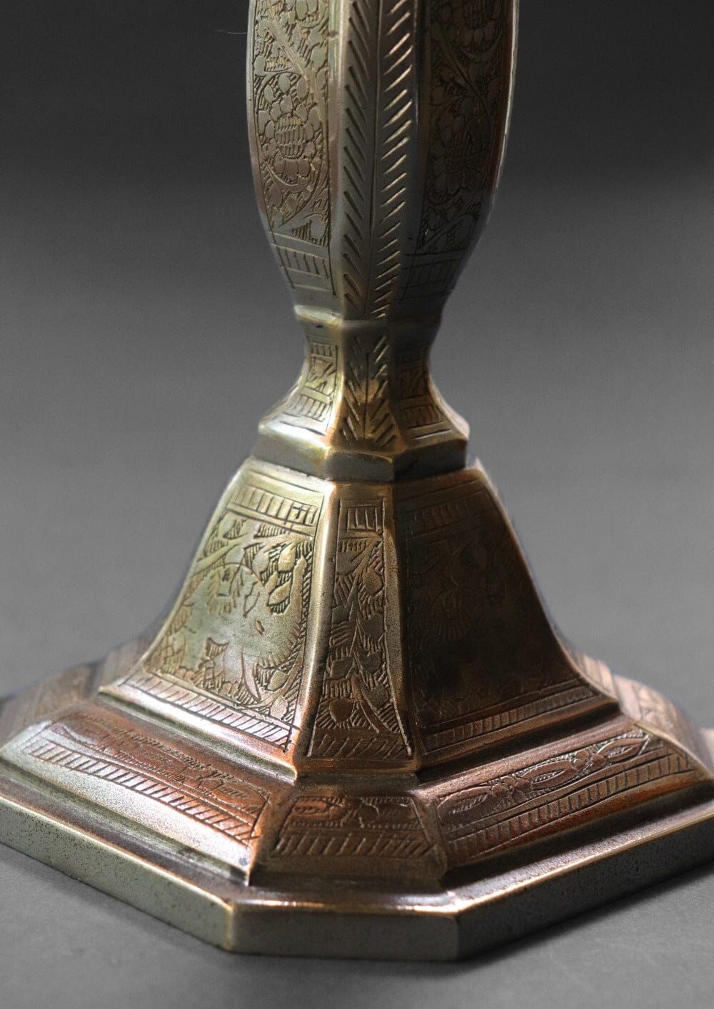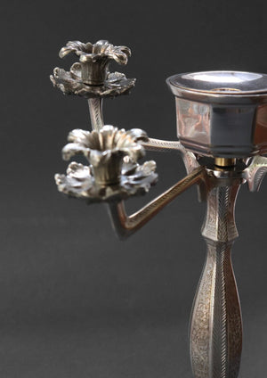 Very interesting Art Deco style candelabra with 5 scones. This candlestand always blows my mind because the previous owner has replaced 4 of the outer sconces and drip pans with floral Art Nouveau style ones! Further, the capital and the base have very Indian patterns hand engraved on them. The meeting of these three very different styles on one candelabra results in a very unexpected, surprising and unique piece.