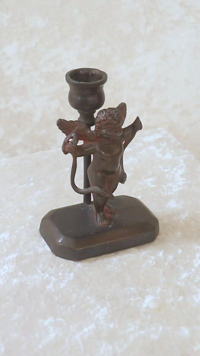 Vintage candle stand featuring an angel holding two snakes. It could possibly be modelled on Hercules, the Greek mythological hero who as a baby, strangled two serpents sent to kill him in his crib. The base is solid and a sconce stands behind the statue. Could be bronze or copper, around 1970s.