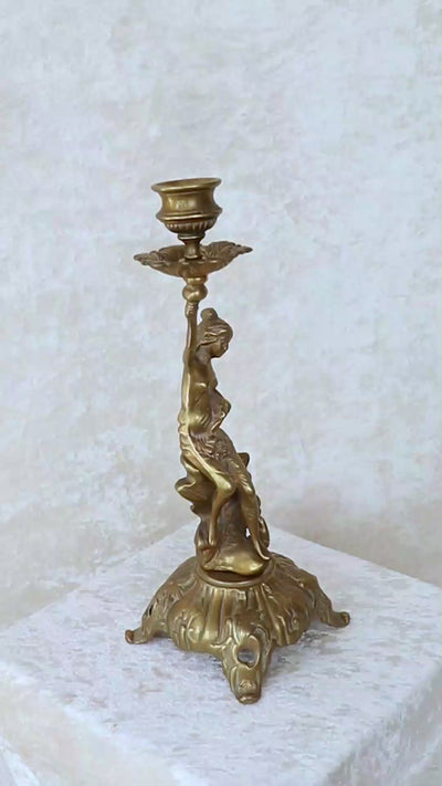 Vintage Art Nouveau candlestand featuring a woman holding up a sconce. The raised base is a beautiful mound with acanthuses and the bobeches are shaped as flowers in classic Art Nouveau style. Most likely made in France in the 1920s.