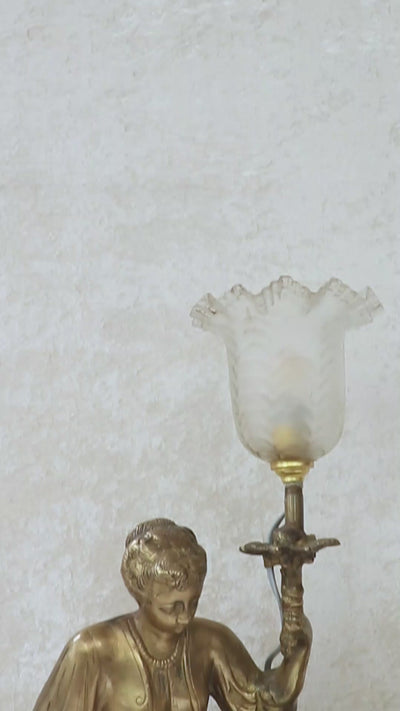 Figural vintage table lamp featuring a Victorian lady holding up the lamp. The flowing dress and design on the jacket is beautifully detailed, and the lady is sitting on the floor reclining on her hand, in an unusual pose, most lamps feature a standing lady. The lamp is cast in brass, and the electricals are in perfect working condition. It has a frosted glass shade with scalloped edges and would be a great addition to a living room.