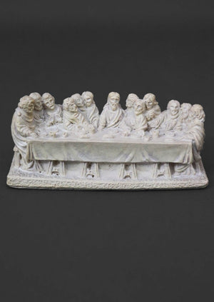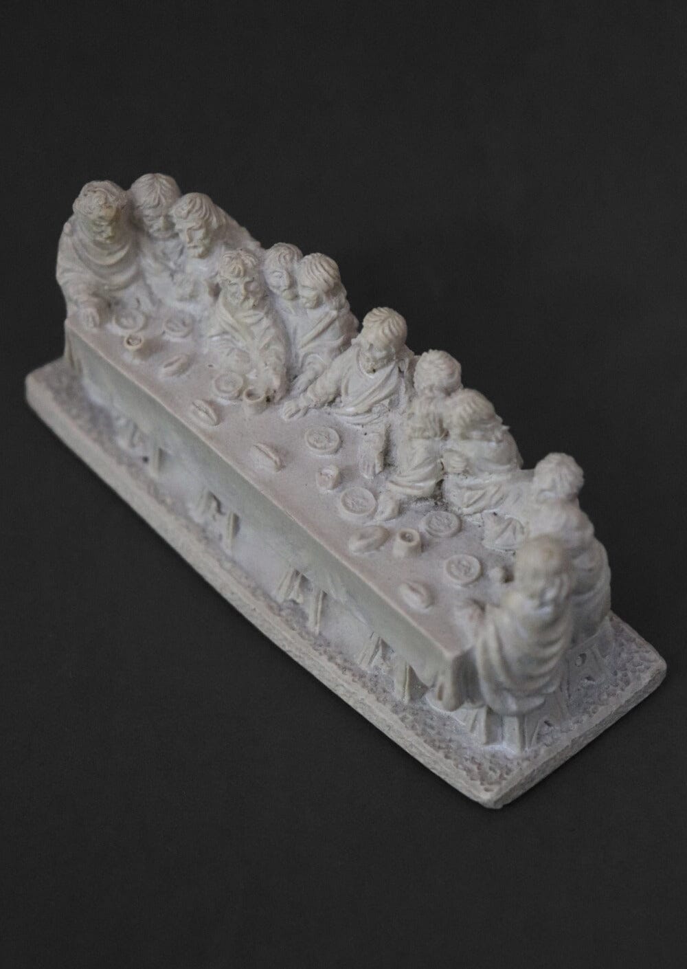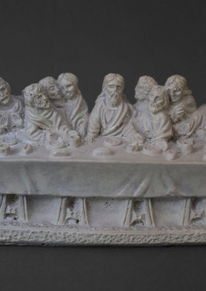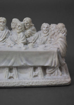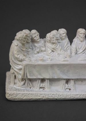 Vintage alabaster cast sculpture of the Last Supper in miniature. The details of the expressions are very clear, as is the drapery of the clothes and table cloth. Likely to be from Italy, mid 1900s.