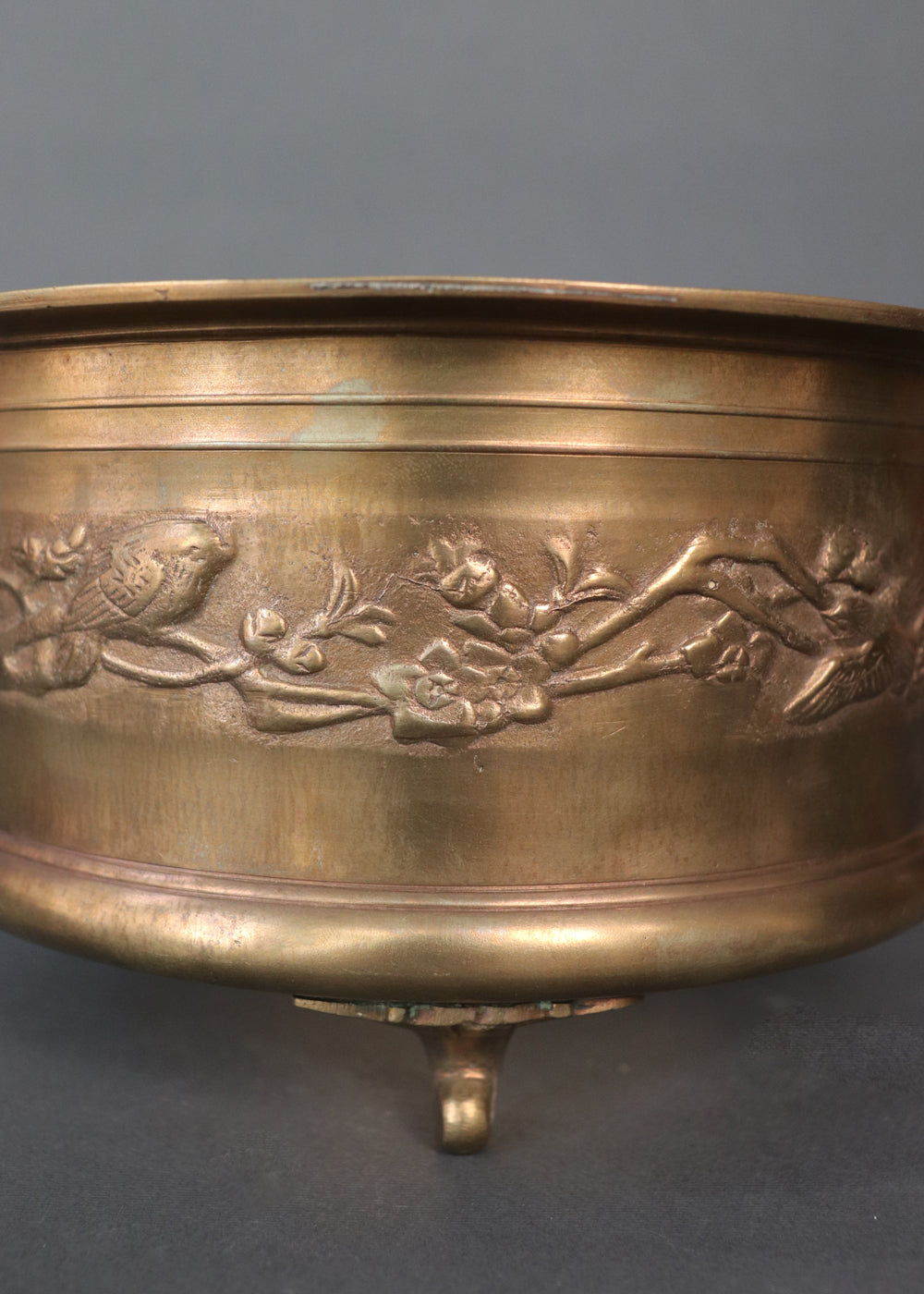 A bronze planter or Jardinière from the Meiji period the body of which is ornamented with birds, flowers and branches in high relief. It is raised and stands on 3 legs and has one handle, with the other one missing. Made in early 1900s Japan.