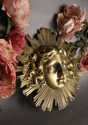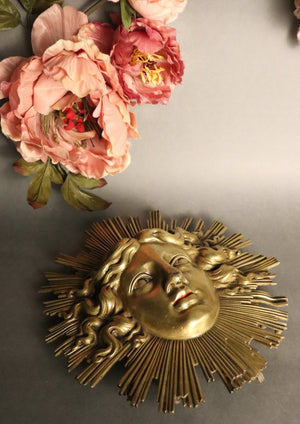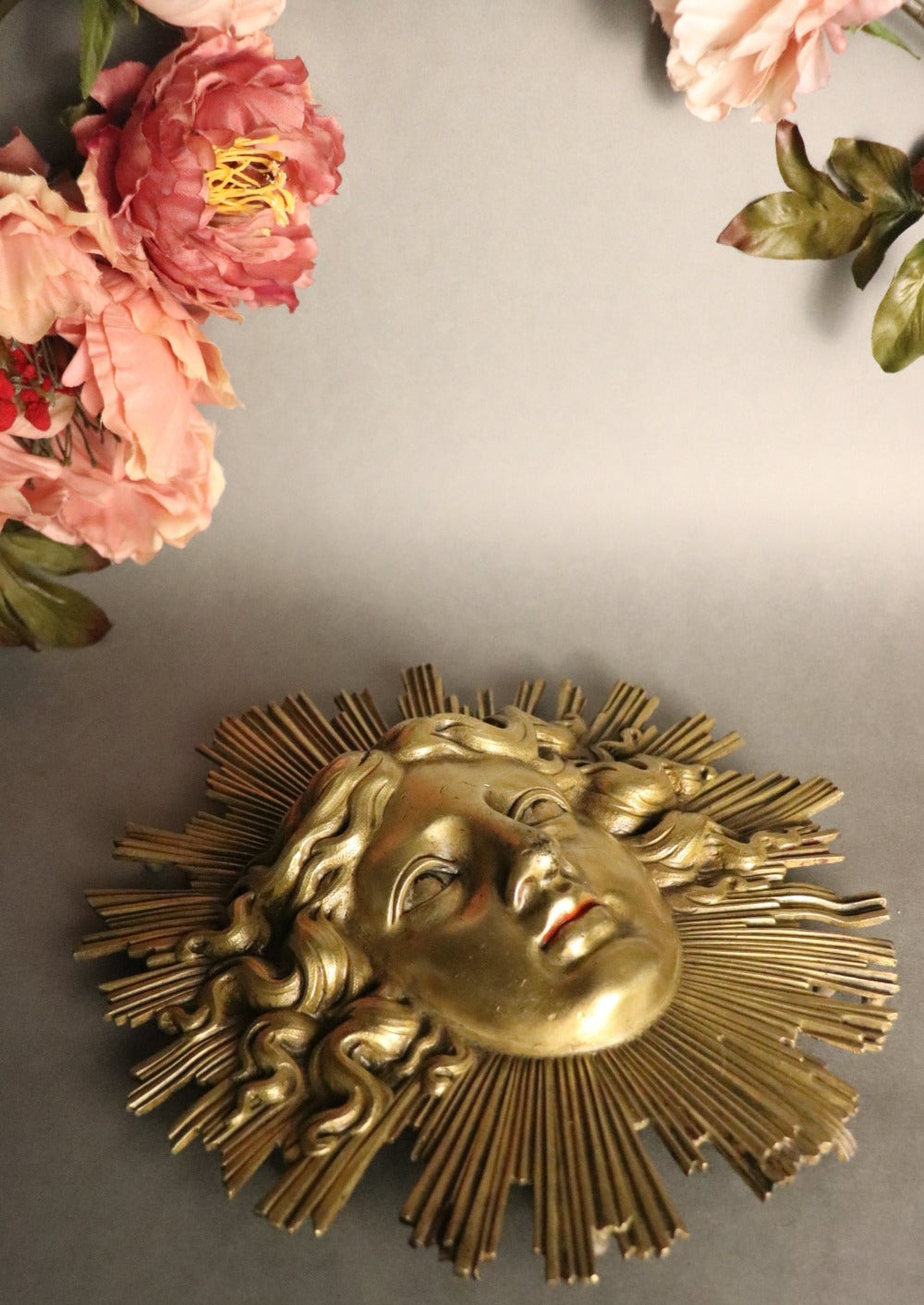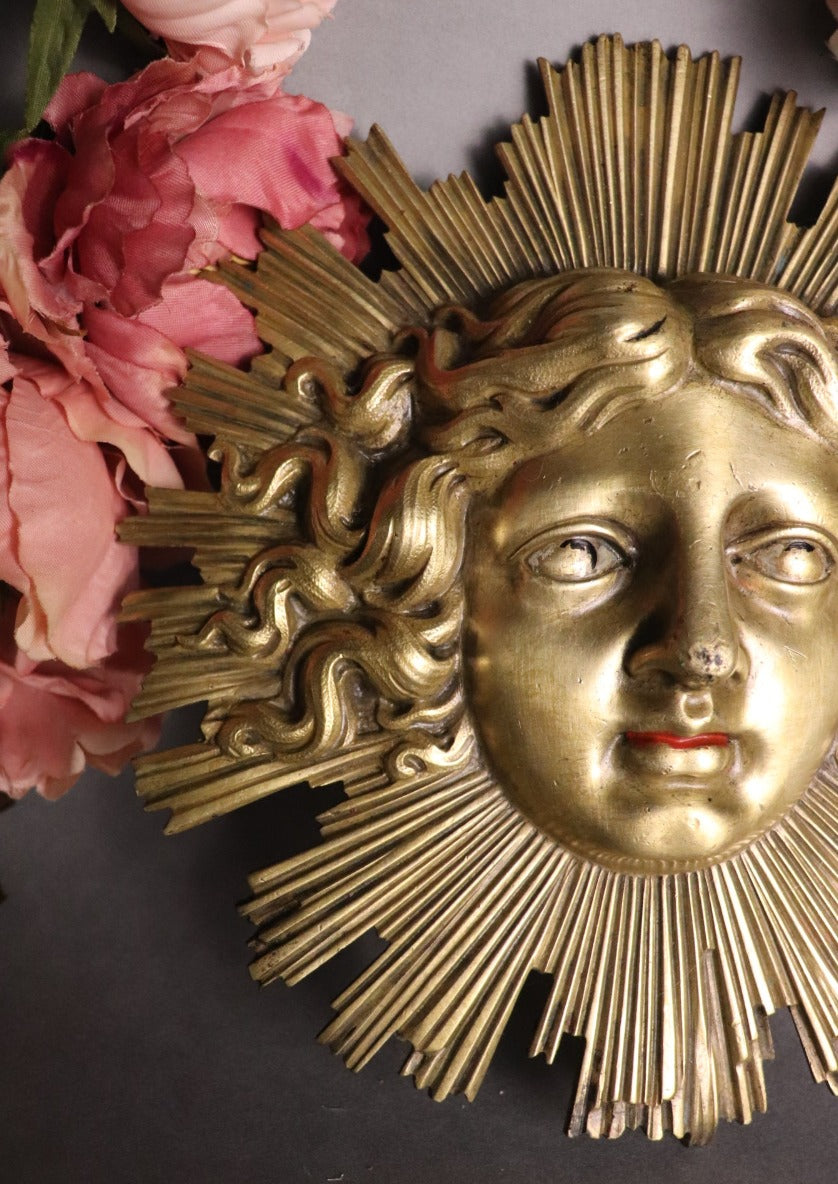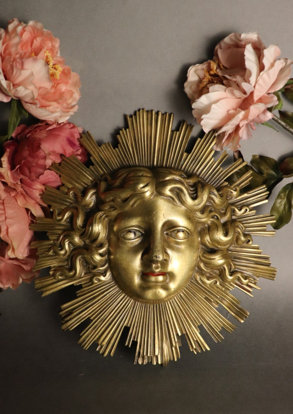 Rare bronze architectural fragment or wall plaque representing King Louis XIV of France, who adopted the sun as his symbol. His reign was one of the most prosperous and culturally rich periods for France. His reign of 72 years and 110 days is the longest recorded of any monarch of a sovereign country in history.