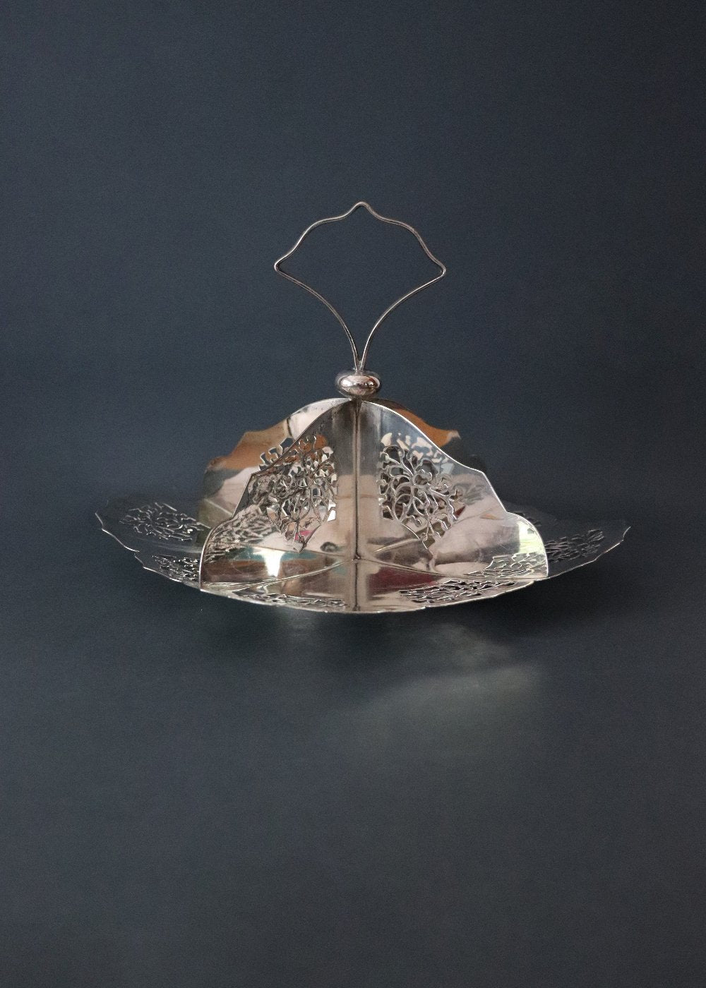 Gorgeous vintage sectional serving dish for sandwiches, tea cakes, bonbons, etc. This silver plated dish has 4 sections and a carrying ring on top, and beautiful pierced openwork throughout. It is secured with a screw that can be taken apart for polishing and cleaning. It is in excellent condition given it’s age! It is stamped EPNS and is made in England most likely in the 1930s.
