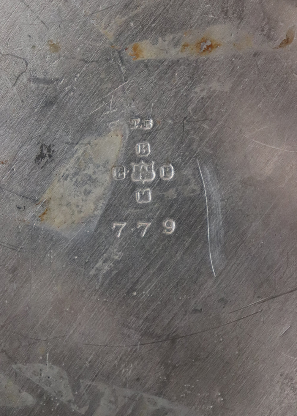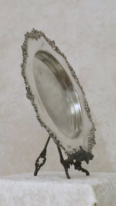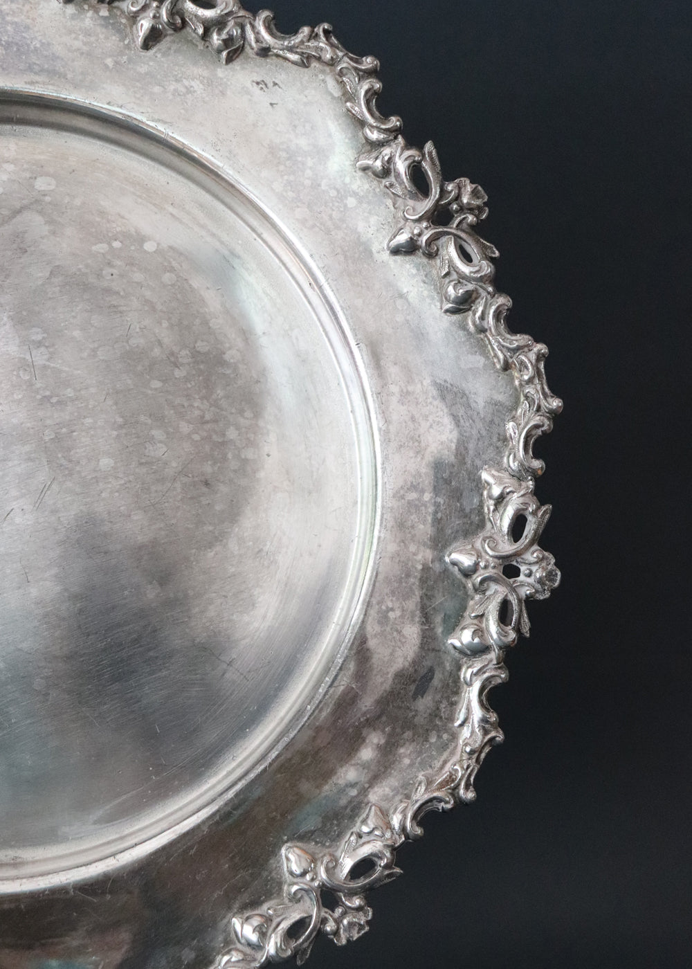 Beautiful vintage silver plated platter decorated with a rim of flowers and bows in high relief. The underside has the marks B&G within a shield which means it was made by Boardman & Glossop, Sheffield. It also has the mark EPBM which stands for Electro Plated Britannia Metal, which means it was made during the late 1800s to the early 1900s. The plate has a few dings on one side commensurate with it's age and the silver plating is in excellent condition.