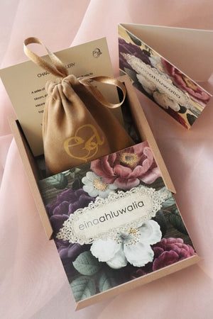 Eina Ahluwalia jewellery is packaged our beautiful keepsake box, a care card and a personal note from the designer. If this is a gift do let us know the name of the person you’d like Eina to address the note to, along with your personalised message if any.