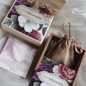 Eina Ahluwalia jewellery is packaged our beautiful keepsake box, a care card and a personal note from the designer. If this is a gift do let us know the name of the person you’d like Eina to address the note to, along with your personalised message if any. Orders marked as gifts (in Cart) are sent without Invoices or prices for a seamless gifting experience.