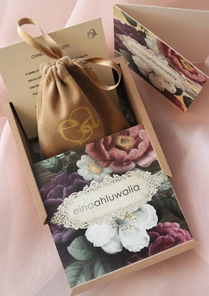 Eina Ahluwalia jewellery is packaged our beautiful keepsake box, a care card and a personal note from the designer. If this is a gift do let us know the name of the person you’d like Eina to address the note to, along with your personalised message if any. Orders marked as gifts (in Cart) are sent without Invoices or prices for a seamless gifting experience.